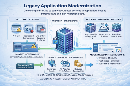 Legacy application modernization is a consulting-led service that connects outdated systems to appropriate hosting infrastructure while planning migration paths. Applications running PHP 5.6, deprecated frameworks, or end-of-life operating systems cannot safely remain on shared hosting platforms. Managed VPS provides the dedicated, customizable environment needed to isolate these workloads during assessment and modernization. We combine infrastructure expertise with AI-assisted code analysis to create realistic upgrade timelines—avoiding the "rewrite everything" trap while systematically reducing technical debt and security exposure.